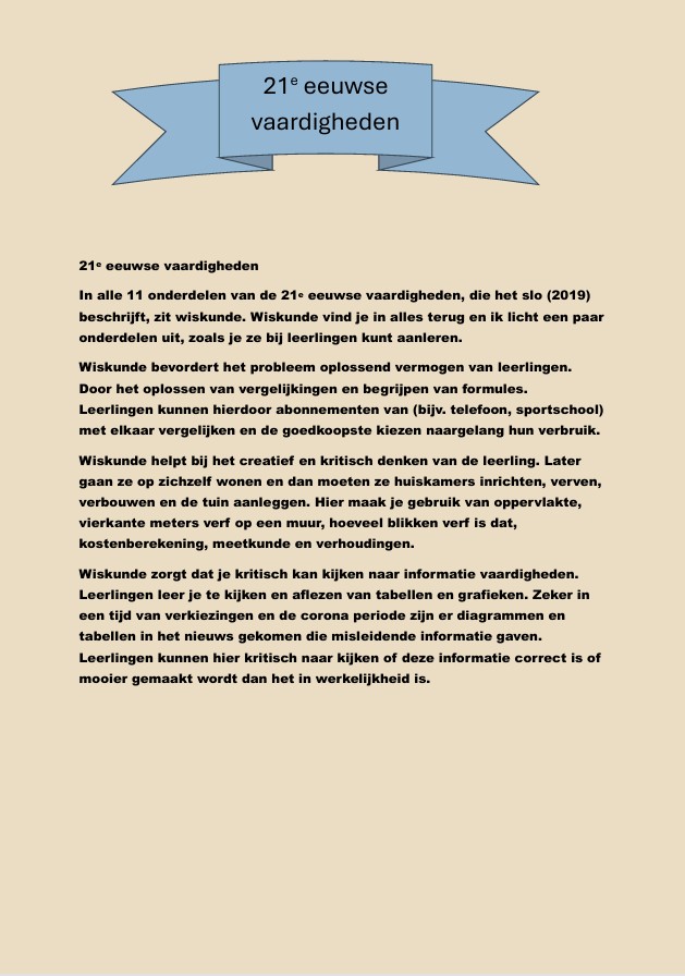 In de opleiding is mijn visie over wat wiskunde geven inhoudt wel veranderd. In de lessen wiskunde zitten veel vaardigheden welke beschreven zijn door het SLO als de 21e eeuwse vaardigheden (bijlage 21e eeuwse vaardigheden). Het probleemoplossend vermogen van leerlingen stimuleren vind ik een waardevolle vaardigheid om te ontwikkelen (Drijvers, 2015). Het toepassen van de vier fases van Polya helpen leerlingen hierbij om problemen op te lossen. In mijn feedback kom ik terug hoe ik dat in de lessen doe.