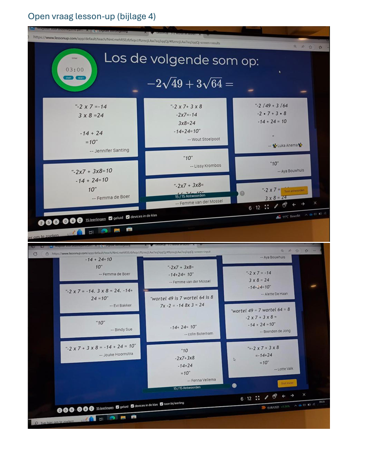 Door deze manier van het starten van de les merkte ik dat ik de fases van Polya grotendeels hanteerde ( Bijlage open vraag). Ze kijken of ze de opdracht begrijpen, gaan een plan bedenken om de opdracht op te lossen, uitvoeren en we bespreken de opdrachten klassikaal. hierbij kijken we terug naar de opdrachten en kunnen er verschillende oplosmethodes verschijnen op het bord. Bij het bespreken van de opdrachten staan de antwoorden van elke leerling op het digibord. Doordat ik een overzicht heb van alle antwoorden op het bord kan ik de denkwijze van de leerlingen analyseren en met vragen erachter komen hoe ze tot een antwoord zijn gekomen. ( Bijlage handelingsbekwaam)